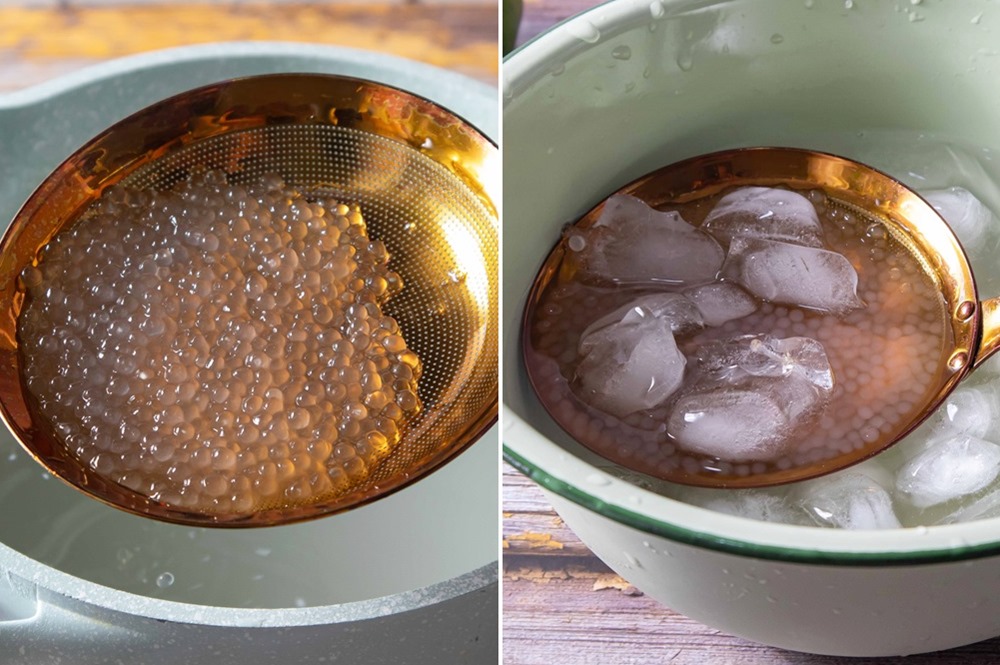 2. 把西米撈起,放入加了冰塊的開水中浸泡冷卻,撈起備用。