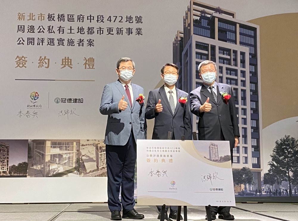 基地面積約1,400平方公尺的「新北市板橋區府中段472地號周邊公私有土地都市更新案」,原址為市長官邸,因使用效能不佳,且公有土地面積占全區更新範圍31.46%,經市府評估後,決定以公辦都市更新方式活化公地。在新北市政府副市長陳純敬的見證下,於今年9月23日舉辦簽約儀式,由新北市政府財政局局長李泰興、冠德建設總經理洪錦欽共同舉行簽約儀式,正式啟動公辦都更案開發計畫,預計將於2024年開工、2027年完工。