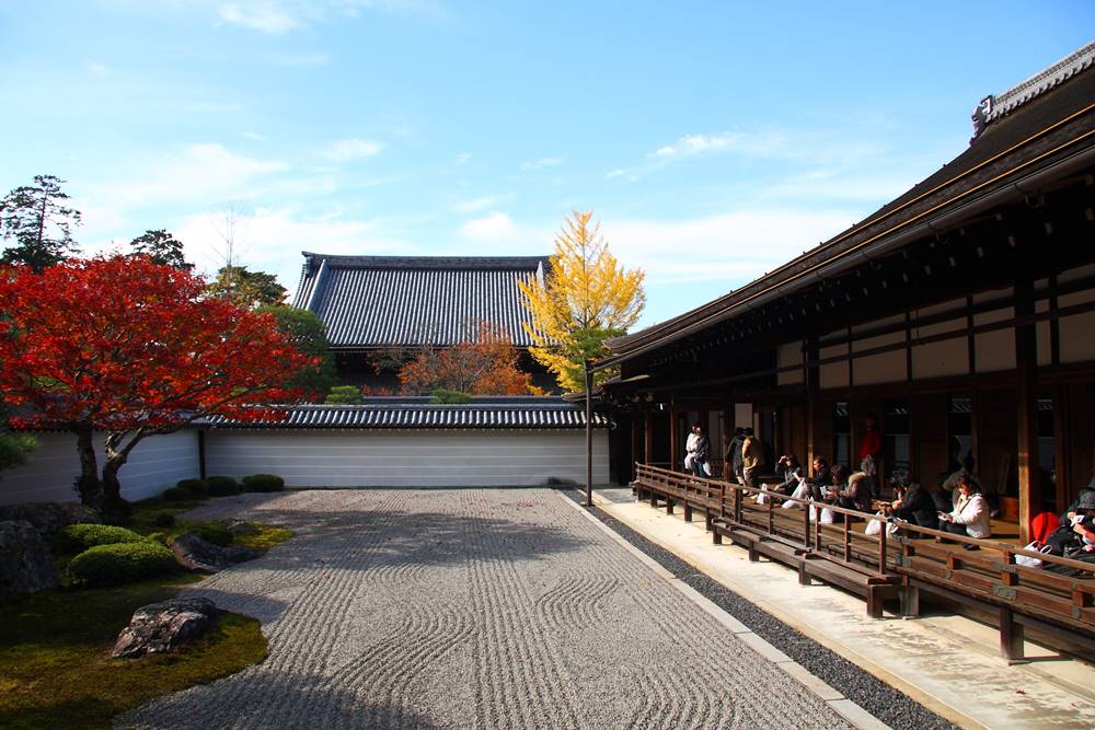 ↑龍安寺方丈庭園是京都最知名的景點之一,以白砂、石組抽象化爲海、島、林,勾勒出一處世外桃源。