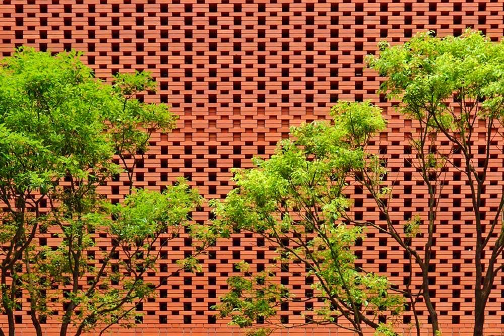↑紅磚之間刻意外露鋼管結構,形成多元材料融合的特殊美感,令人耳目一新。(圖為豐泰基金會文教綠園區)