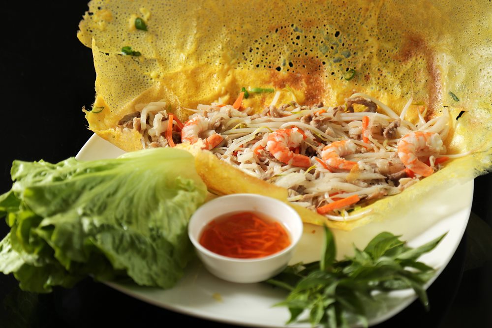 店裡有一道月亮煎班燒,造型十分吸睛,加了薑黃粉煎得薄脆的大餅皮裡,鋪滿了蝦子、豆芽菜等,用生菜包起餅皮、配料,蘸特調魚露醬大口吃,滋味清爽、口感豐富。
