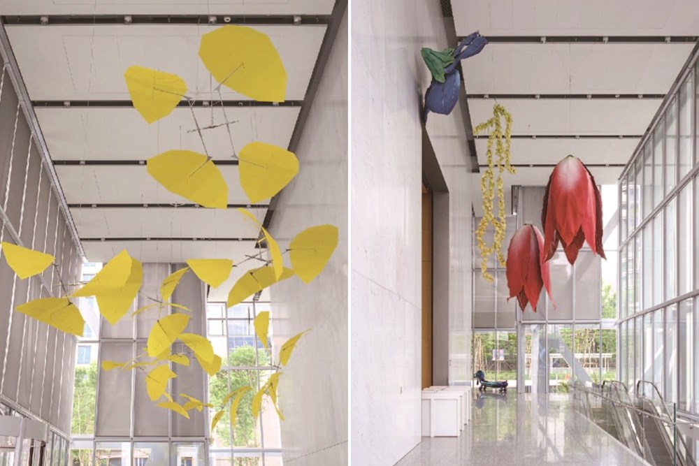 最後,筆者推薦自己很喜歡的日本風動藝術家新宮晉作品,位於大廳挑高處,他的裝置藝術與大廳中的空氣流動產生緩慢轉動的互動關係,當人隨著旋轉門進入時,也會些微帶動著這個透過自然轉化為動力的裝置藝術,讓人感受參與其中的樂趣。