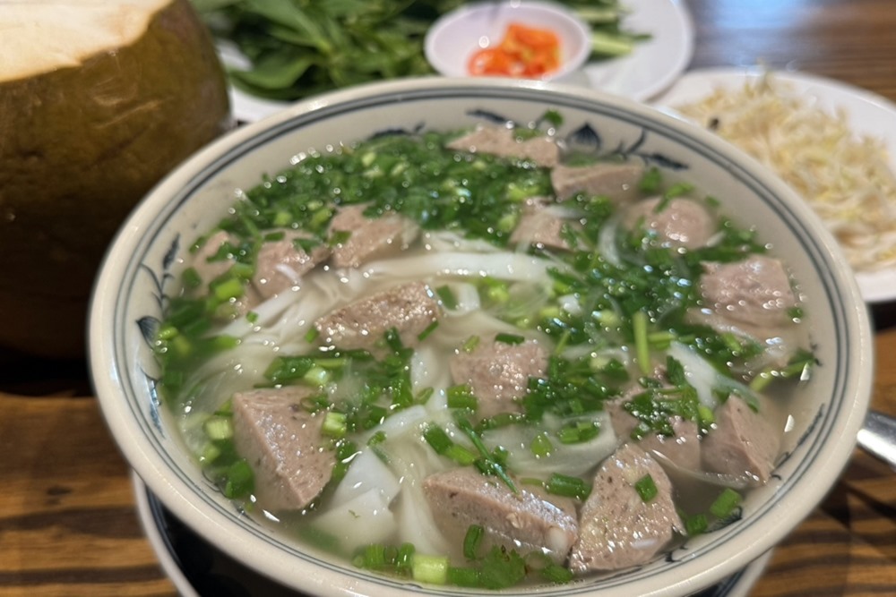 在越南,除了人人喜愛的生菜捲,另一樣絕不能錯過的當然是 Pho 越式河粉。距離濱城市場步行兩分鐘的 Phở Việt Nam(District 1),外觀平凡卻是2023米其林指南推薦餐廳,擁有五星好評。桌上擺滿河粉必備的豆芽、越南香菜、辣椒、檸檬,旁邊還有蒜頭、越式魚露、醋等各種佐料;此時再配上一顆現剖椰子汁,真是人間美味。