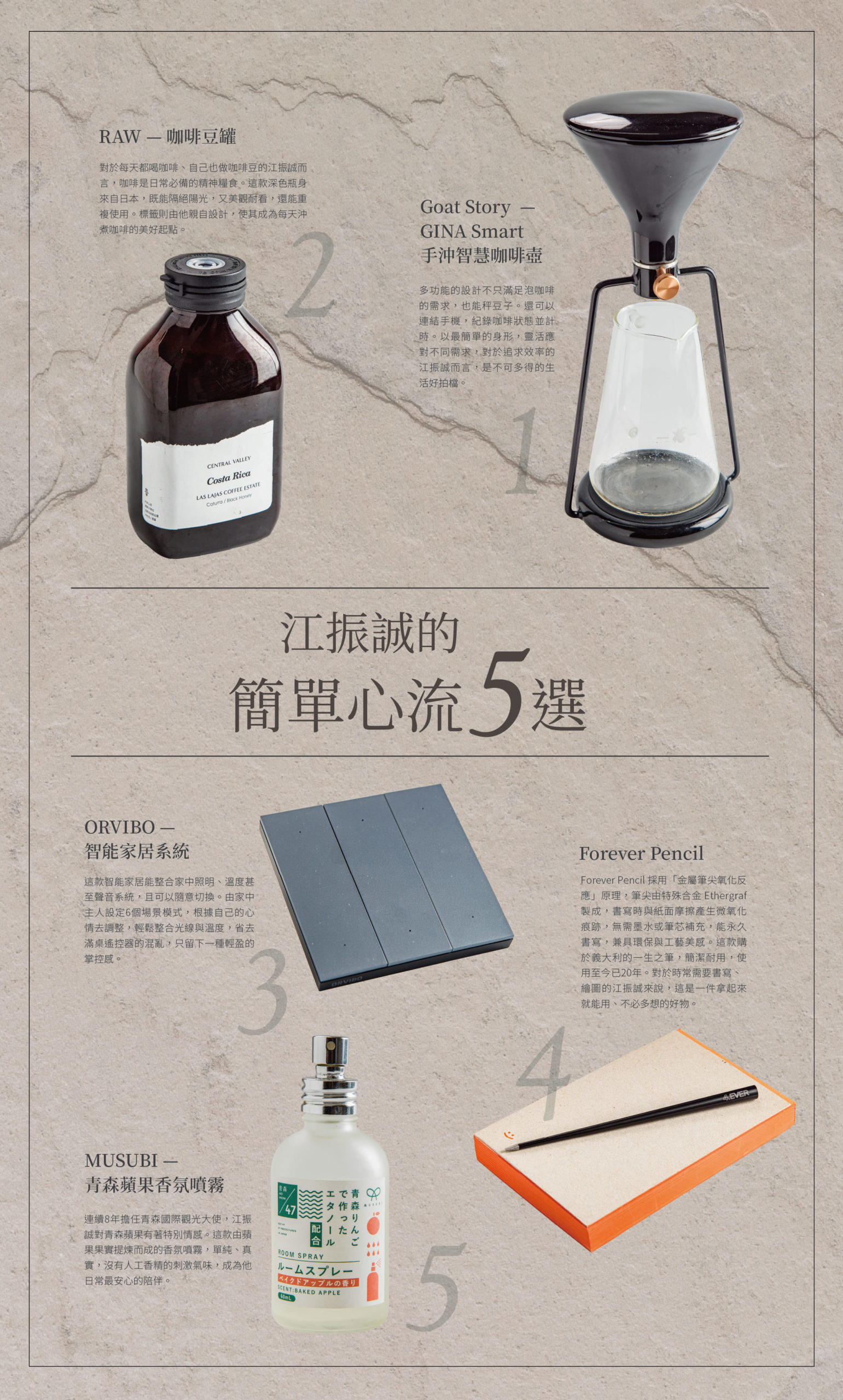「我喜歡的日用品都有很『直接』的特性,越簡單耐用越好,不需要浮誇,也不用有太多裝飾,大概就像我的髮型一樣!」江振誠笑著說。他買東西往往不是一時衝動,而是因為確實存在需求。往往要等到使用兩三年之後,發現它的不可替代性,才會去追尋這個物件背後的故事。