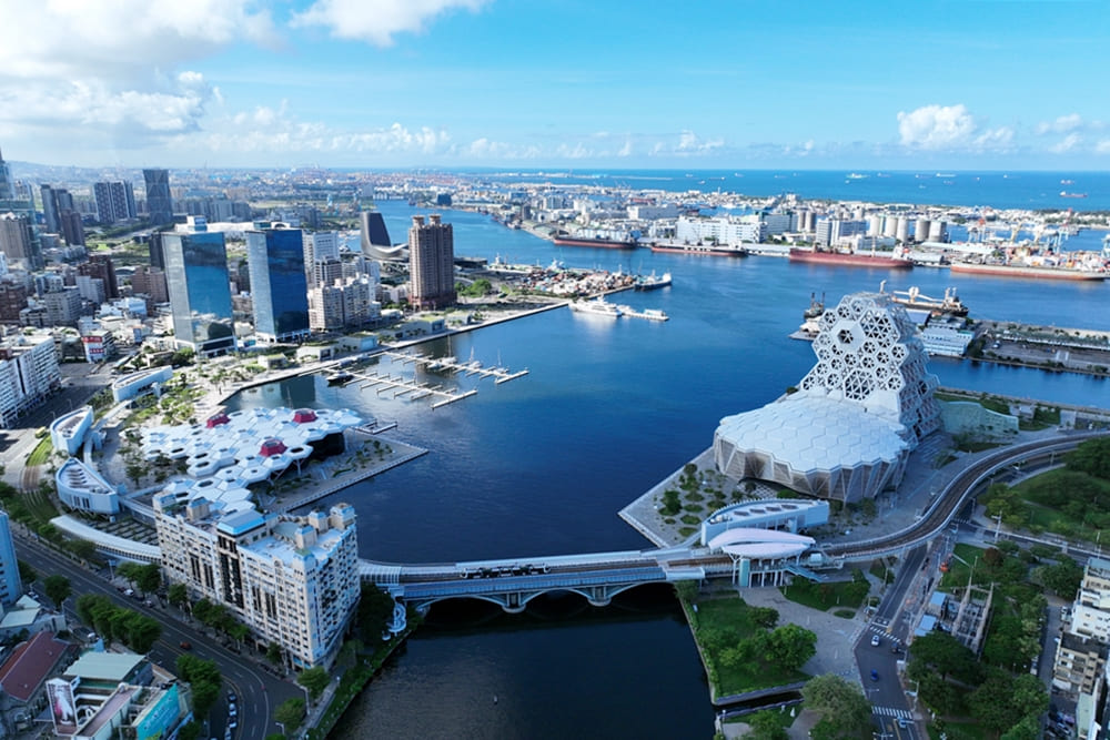 ↑高流園區透過人行橋連結愛河兩岸,自啟用以來,已然成為南台灣的文化地標,推動城市的發展與國際能見度。