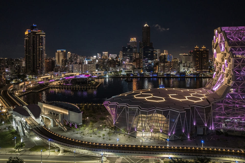 位於高雄亞洲新灣區核心的高雄流行音樂中心(Kaohsiung Music Center),以兩座塔樓與禮堂屋頂最為醒目,宛如自海面捲起的巨浪。六邊形立面外皮在光影中不斷變化,使這座臨港建築帶著一種呼吸般的律動感。