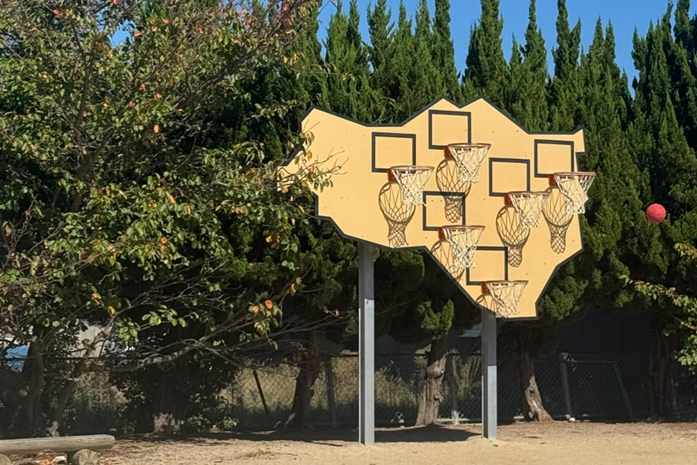 從豐島唐櫃港往海邊走,海岸區域名為唐櫃濱。西班牙藝術團隊 Llobet & Pons 的作品《無人勝出-多重籃框》,以六個籃框象徵豐島六個地區,鼓勵參觀者自由投擲,沒有輸贏,十分療癒。