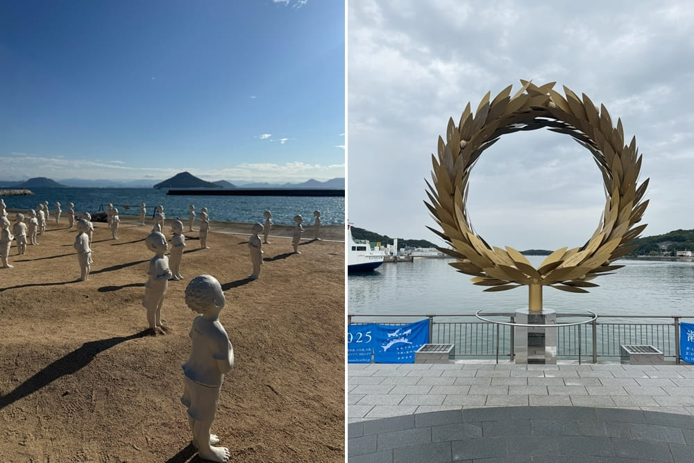 ↑林舜龍,《Beyond the Border》,位於豐島甲生海岸廣場;(右)崔正化,《太陽的贈禮》,位於小豆島土庄港。