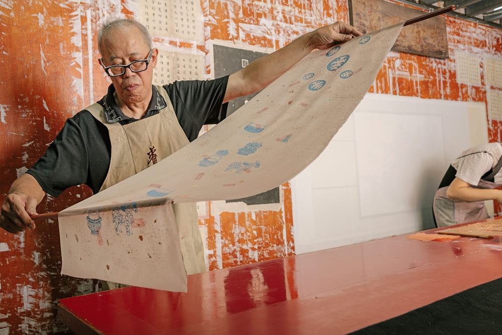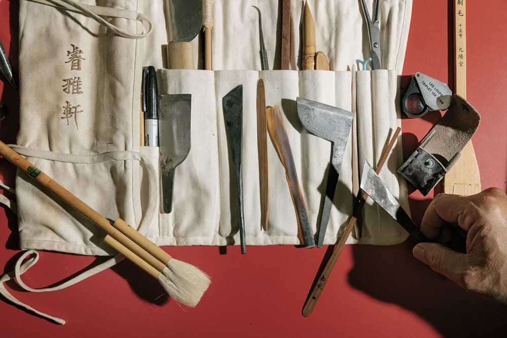 走進「睿雅軒」,抬頭便見一面掛滿拓片與書畫的牆;桌上堆著各式形狀的紙張樣本;書架深處,是各式紙與墨,他研究水分與糨糊的比例,甚至將中藥運用進染紙、調製防蟲糨糊。根據紙張顏色,會選不同色調與濃度的糨糊,力求以最少的介入,保留最原初的物件質地。