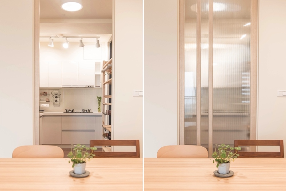 若廚房採玻璃拉門,使用具有紋理的長虹玻璃或毛玻璃時,要注意將光滑面朝向廚房,以防油污卡縫、清潔困難。這些細節雖小,卻是讓家更乾淨、更舒心的關鍵所在。
