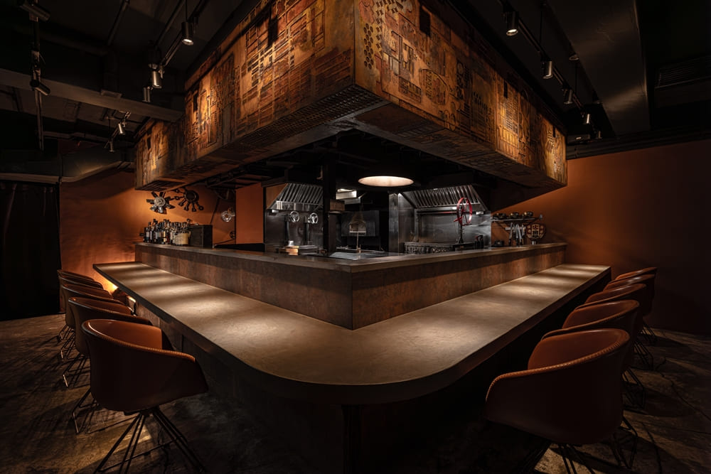 FirePlay的空間設計呼應這份理念。餐廳採取L型日本料理板前的設計,讓客人得以近距離觀看主廚「玩火」的過程。火焰竄動、滋滋聲響,彷彿一場舞台劇,料理完成的瞬間便能直接端到客人眼前。這樣的動線一來節省了服務人手,更重要的是,維持了火焰料理的力道與臨場感,讓用餐過程成為一場沉浸式的表演。