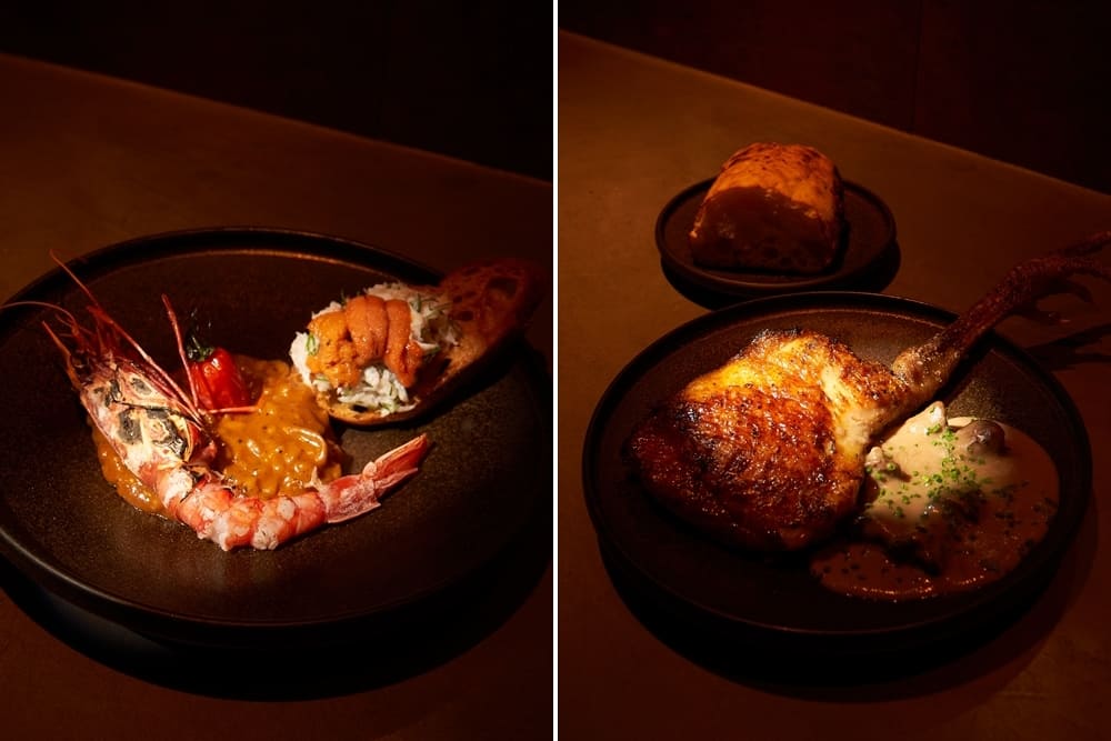 ↑(左)花蟹飯/胭脂蝦/法棍/北海道海膽/台南烏魚子;(右)薩索雞/法式芥末籽醬/雞心/蝦夷蔥