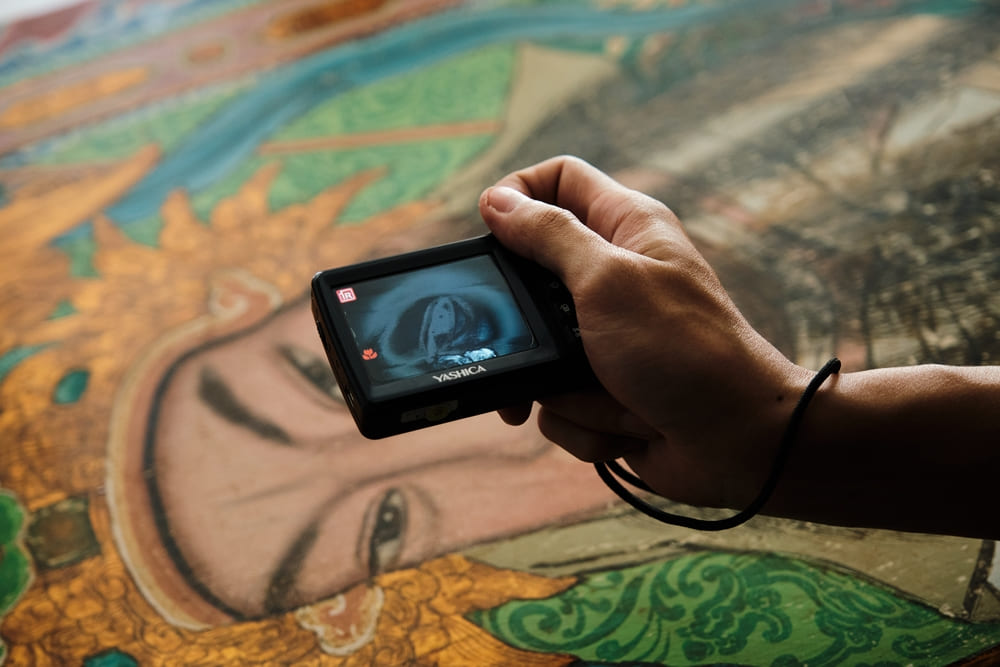 蔡舜任形容,修復分析彷彿收集大數據,顏料層層堆疊如同地質剖面,留下翻修痕跡與歲月的補綴。什麼該留、什麼不該留,往往最考驗修復師。「我很少強調修舊如舊。」他解釋,「百年廟宇經歷無數次整修,留下無數堆疊的痕跡,該停止在哪個時間點才叫『正確』,沒有一個標準答案。」在寬闊無邊的時間世界裡,所謂的「舊」是多不精確的詞語,每個人定義都不同。