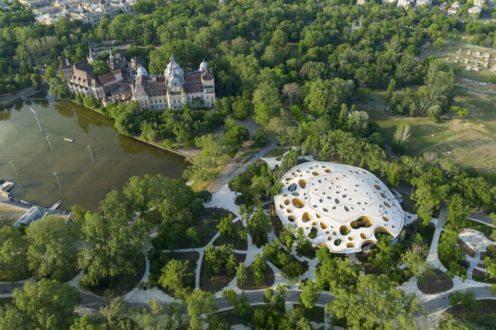↑坐落布達佩斯城市公園裡的「匈牙利音樂之家」,低伏屋頂讓光影與自然聲息自由流動。