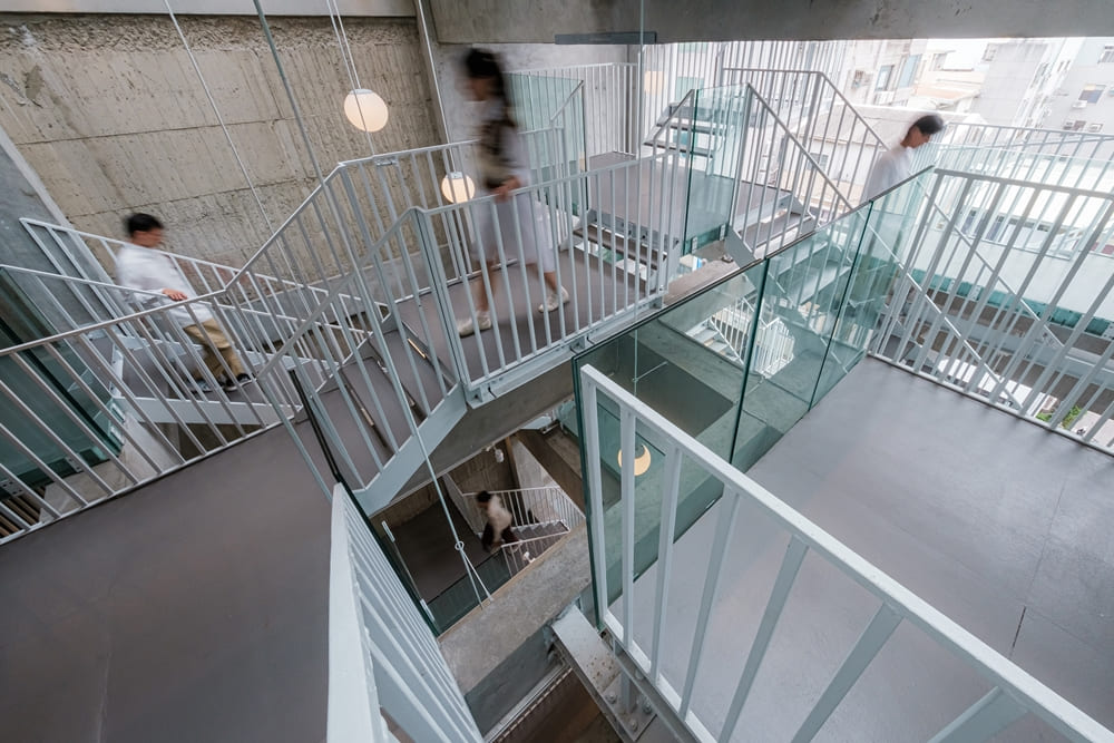 在這裡,樓梯不只是通往樓上的工具,而是行走的風景;轉角不只是結構需要,而是一種刻意保留的停頓。建築內部以多層次平台與開口構成,視線可以不斷穿越、交錯,形成一種近似城市巷弄的視覺經驗。你可能在某一層遇見陌生人,也可能在轉身時,突然看見一束從高處落下的光。