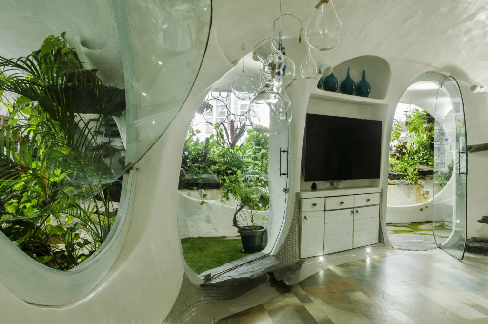 在2006年於印度孟買創立的The White Room Studio,以打造充滿流線、孔洞和有機造型的空間聞名,每一次創作,都是在追尋材質最原始的美麗,以及最完美的線條和比例。他們將法國建築設計Frank LLoyd Wright曾說過的:「Space is the breath of art.」奉為圭臬。本文介紹的「Garden Room」可說是團隊招牌設計的極致體現:富有生命力的建築線條與環繞滿室的綠色植栽,都讓成品顯得更加生氣蓬勃,宛若身處一座自然生成的科幻森林。
