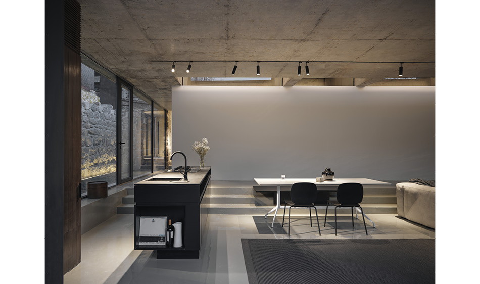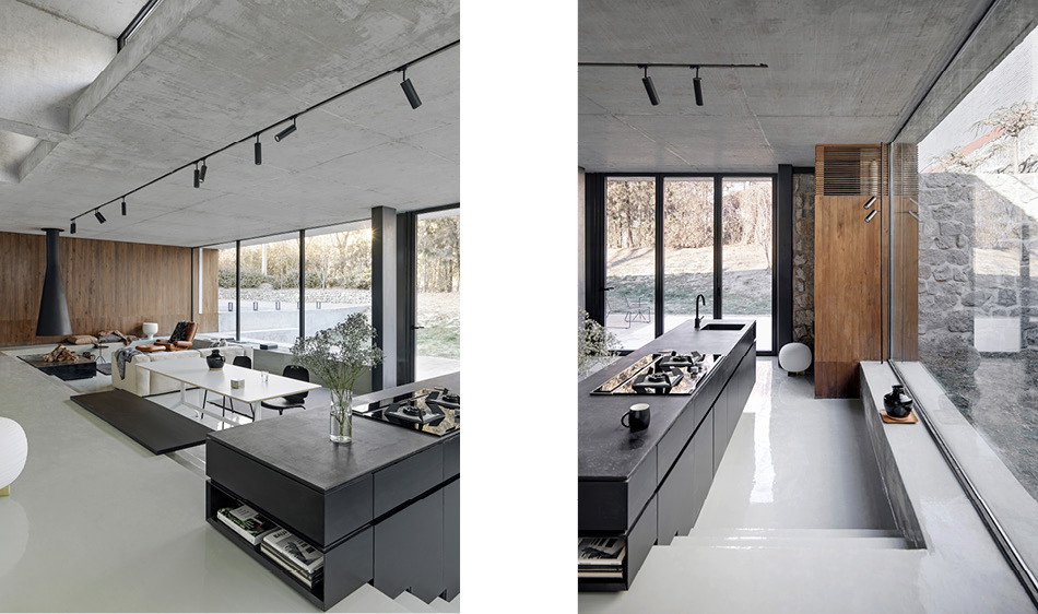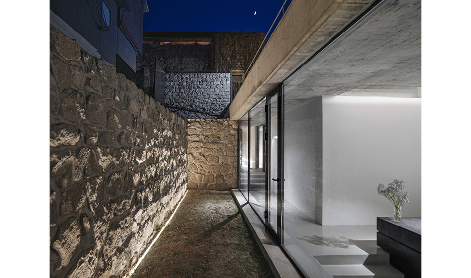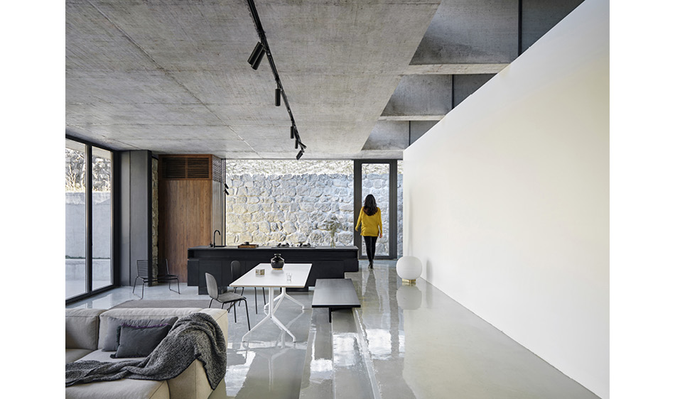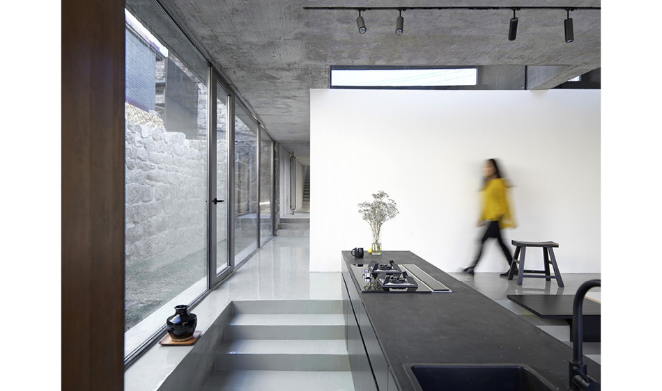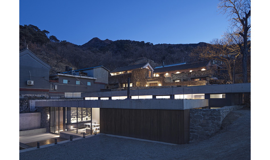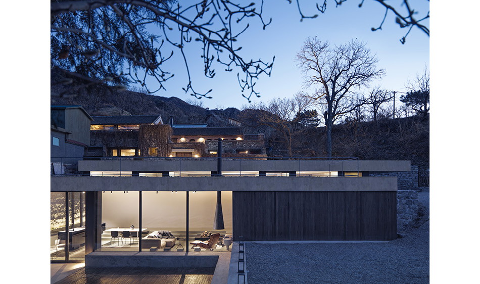 委託人所持有的物件,因為地勢較高,又坐南朝北,基礎條件其實非常好,只是面臨了上述的挑戰,所以設計團隊保留了絕大部分的石牆,僅將北側的石牆換成大面積的玻璃落地窗,並移除物件北方部分的土壤,建制了寬敞的露台,以眺望北方的長城景致。而為了讓新建的部分能與舊有的基礎完美結合,團隊以拋光混凝土作為材質主基調,整體看起來相當柔和融洽。