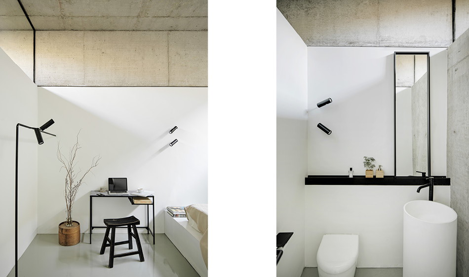 這間新落成的四房民宅,主臥室及客房位於房屋的南邊,四間房由一條長廊連通,房內挑高的天花板跟位置較高的氣窗,同時具備了隱密性卻又不失寬敞,不會讓人感到壓迫,石牆貫穿了主臥室和其他三間客房,天然材質也為空間帶來了沈靜的效果,加上每間房都有私人衛浴設備,是放鬆休息的絕佳獨立空間。