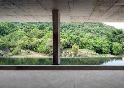 建築物前端大型水池,功能多樣,從山上引下的水在這裡做濾化清潔,提供給學員日常使用。此外,它彷彿一直盯著遠處的眼睛,確保學員在冥想時不會被外界打擾。建造水池時挖掘的土壤,則被運用在建築的基底。