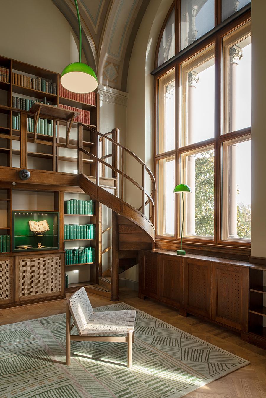 對於裝飾一個百年歷史、具有永久性內飾設計的房間,艾瑪希望能呈現一個跨時間的長遠視角,像是百年歷史的書架與當代設計扶手椅相遇的畫面。此外,能夠在公共空間倡導永續性與環保概念,對艾瑪來說是一個絕佳機會。她引進一系列由永續材料製成的家具、可回收和可重複使用的組件、並有意識的選擇傢俱使用的材料,譬如:選用二氧化碳含量最少的材料—針葉和落葉木材。或是以大麻和海藻取代了皮革。最終,她從圖書館藏書綠色封面得到靈感,將空間改裝色調定為「圖書館綠」。
