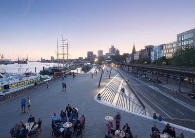 由於此處是漢堡最重要的旅遊景點和公共空間之一,因此本次的工程雖為興建防洪設施,但又必須考量如何讓此處成為觀光客和居民的休閒娛樂場所,不遮蔽風景卻兼具防禦功能,可說是高難度的挑戰。所以歷經十多年的調整與建設,2019年8月終於正式落成啟用。